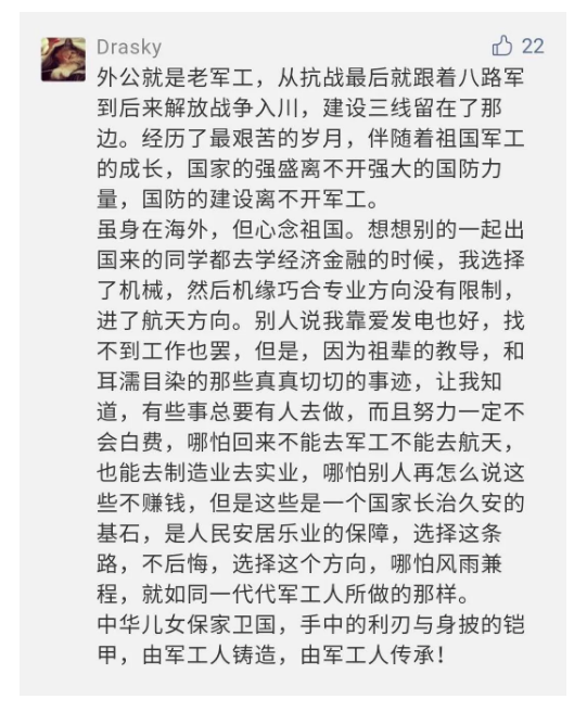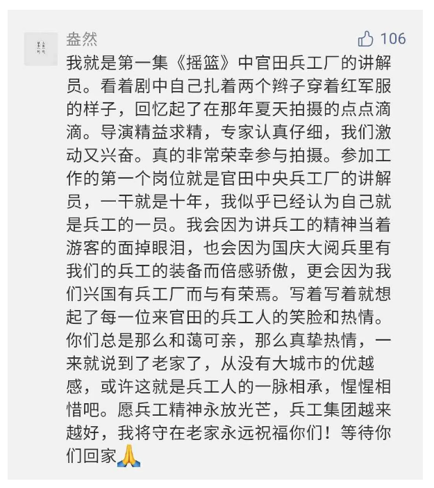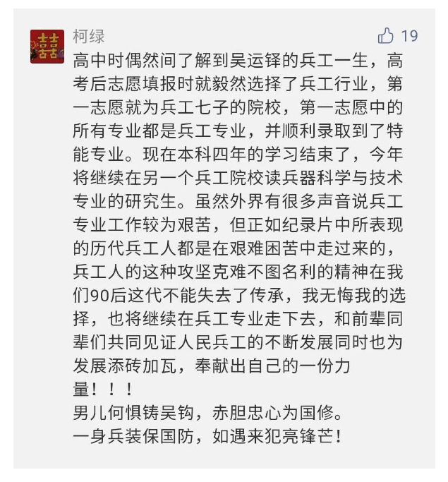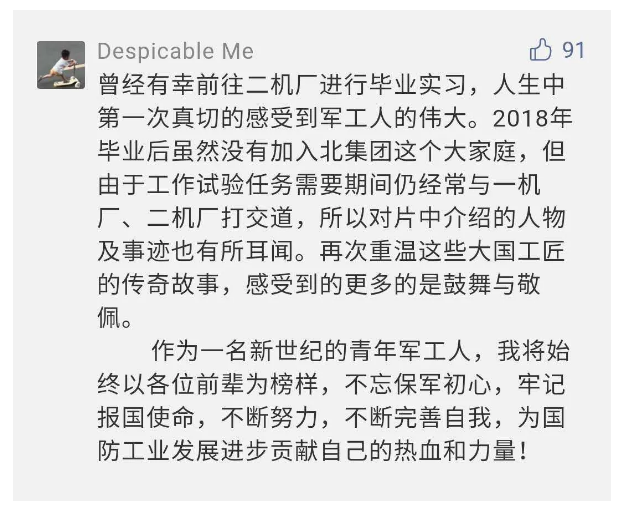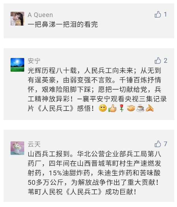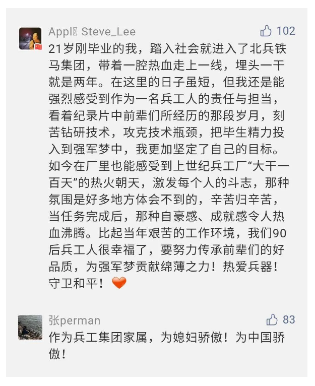作為新時(shí)代弘揚(yáng)人民兵工精神的特色文化成果,紀(jì)錄片的播出,凝聚起廣大兵器干部職工團(tuán)結(jié)奮斗新時(shí)代磅礴力量,極大的增強(qiáng)了兵工人的自豪感,大家紛紛表達(dá)了作為軍工央企一員 “此生無悔入軍工”的使命擔(dān)當(dāng)......