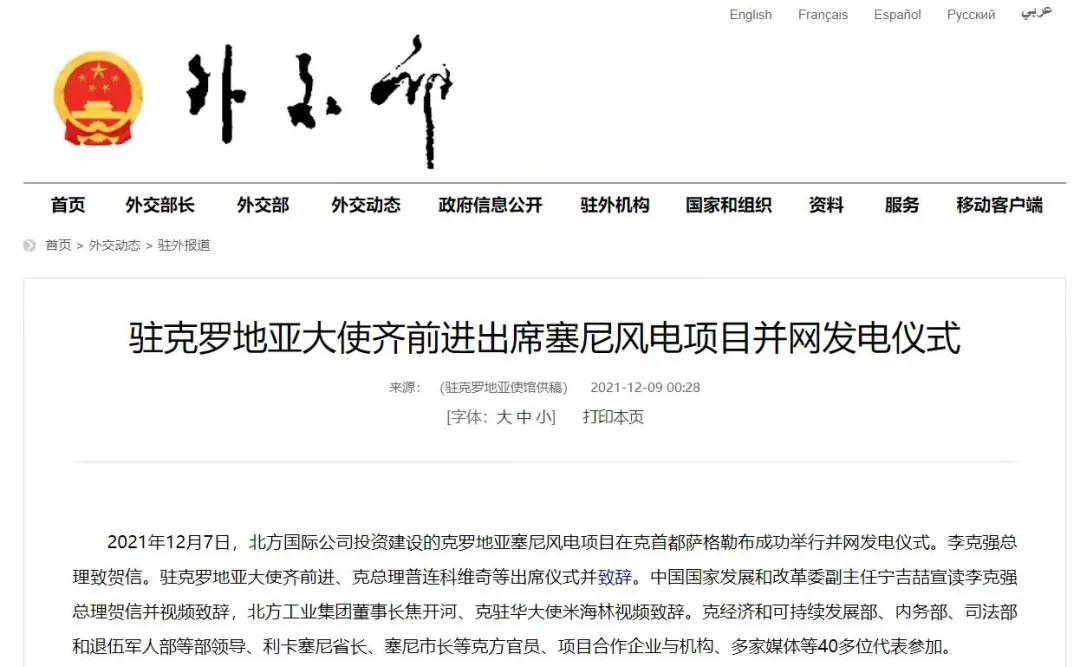 2021年12月7日,中國兵器工業(yè)集團有限公司北方公司所屬北方國際投資、建設和運營的塞尼156MW風電項目在克羅地亞首都薩格勒布隆重舉行并網發(fā)電儀式。李克強總理致賀信??肆_地亞總理安德烈·普連科維奇,中國駐克羅地亞大使齊前進出席儀式并致辭。中國國家發(fā)展和改革委員會副主任寧吉喆宣讀李克強總理賀信并視頻致辭,中國兵器工業(yè)集團有限公司董事長焦開河、克駐華大使米海林視頻致辭。 中華人民共和國外交部報道 普連科維奇總理在致辭中表示,感謝李克強總理發(fā)來賀信,他與中國領導人一直非常重視塞尼風電項目投資與建設。祝賀項目克服疫情與地震等影響,成功并網發(fā)電。增加清潔可再生能源、綠色電力對克乃至歐洲都很重要,克政府的重要戰(zhàn)略和目標之一就是低碳發(fā)展和增加清潔能源供應。塞尼風電項目占克總發(fā)電量將達3.5%,對克實現(xiàn)2022年可再生能源比例30%目標具有很大幫助。此次投資使北方國際成為在克最大的清潔能源投資企業(yè)。非常歡迎更多中國企業(yè)擴大對克投資。 寧吉喆宣讀李克強總理賀信并視頻致辭時表示,2017年11月第六次中國—中東歐國家領導人會晤期間,在李克強總理和普連科維奇總理等中東歐16國領導人的共同見證下,塞尼項目簽署了協(xié)議。項目既是中國堅定踐行綠色發(fā)展理念的具體體現(xiàn),也是中國深化與克羅地亞、與中東歐國家務實合作的生動實踐。希望中克兩國政府部門,企業(yè)等有關各方共同努力、相互配合,運營好塞尼項目,打造出中歐綠色合作的樣板,帶動兩國務實合作持續(xù)深入發(fā)展,造福兩國人民。 焦開河在致辭時表示,在塞尼項目投入運營之際,李克強總理專門致信祝賀。作為塞尼項目的投資方、建設方、運營方,我們備受鼓舞,深感自豪!未來,中國兵器工業(yè)集團有限公司將繼續(xù)深入貫徹落實習近平總書記重要指示批示精神和李克強總理賀信重要要求,以高標準、可持續(xù)、惠民生為目標,與克方合作伙伴坦誠溝通、攜手并進,進一步推動綠色能源建設,努力打造更多的“一帶一路”標志性、引領性、示范性項目,為鞏固中克戰(zhàn)略合作伙伴關系、推進中克從經貿領域到全方位合作貢獻積極力量。 齊前進祝賀塞尼風電項目順利完工和成功并網發(fā)電。他表示,塞尼風電站項目并網發(fā)電是中克兩國領導人親自關注和推動的成果。作為迄今最大的中國在克投資合作項目,塞尼風電項目是中克和中歐綠色合作的典范,對克提高清潔能源生產消費發(fā)揮著重要作用。項目建設過程中為當地培養(yǎng)了許多工程、技術和管理人才,帶動了當地企業(yè)發(fā)展,增加了就業(yè)和稅收,促進了當地經濟社會發(fā)展,充分體現(xiàn)了中國對外經貿合作與“一帶一路”倡議秉持的互利共贏、共同發(fā)展的理念,也是中國積極倡導的綠色低碳發(fā)展合作的典范。 塞尼項目位于克羅地亞中部亞得利亞海沿岸,建設總投資1.79億歐元,總裝機容量156MW,采用39臺4MW風力發(fā)電機組設備,風場面積達42.8平方公里。項目正式運營后,預計每年平均發(fā)電超3000小時,貢獻約5.3億度綠色電力,可減少二氧化碳排放約46萬噸,將為克羅地亞促進能源轉型、發(fā)展綠色經濟提供強勁助力,貢獻了“中國智慧”“中國方案”。 來源/中華人民共和國外交部、綜合有關報道 |